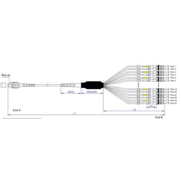 | Connector A | MPO Female (pinless) 24F | Connector B | 12xLC UPC Duplex |